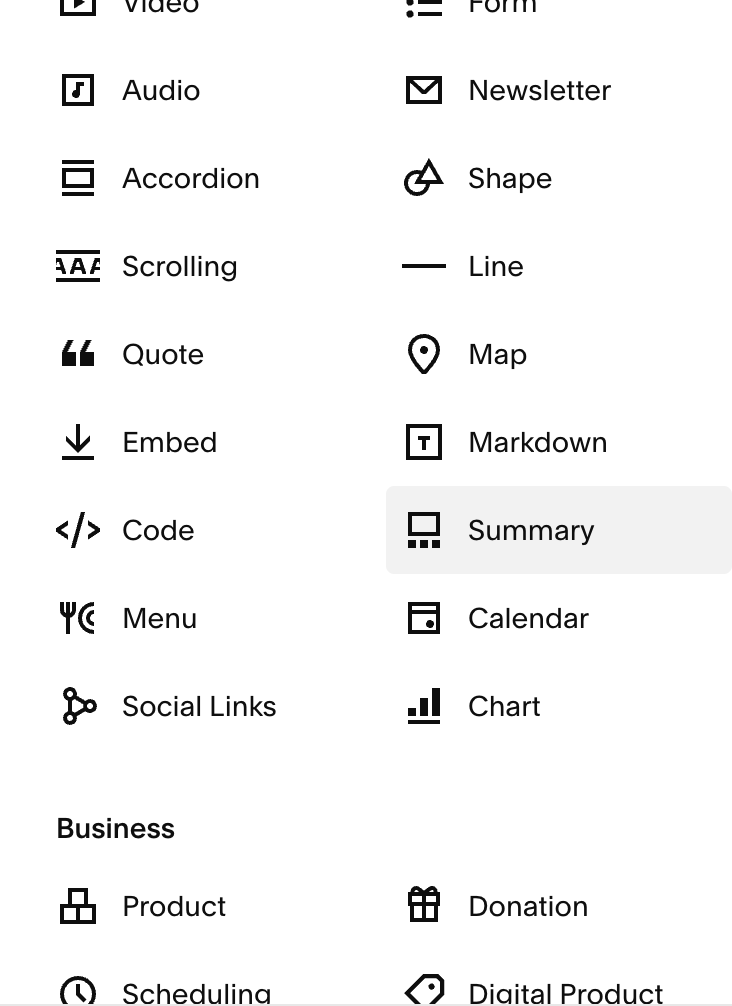 As well as text, images, and videos, you can add the following content to your Squarespace blog site: