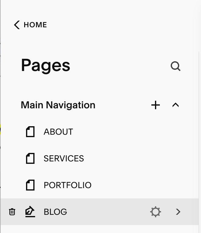 When you hover over your blog page in the Squarespace menu, you’ll see a cog. Click on this to access your general blog settings.